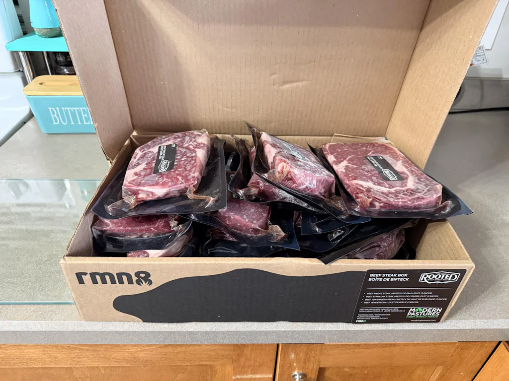 The steak box seemed to be a good deal at first. 14 steaks included works out to under $20 per steak. But then when I eat them they don’t have much flavour at all. Compared to any other Ribeye steaks I’ve eaten in past, they were so tasty. These ones tasted like nothing . and there was fat between the muscles but not marbling like ribeye usually has when I buy them from butchers or even grocery stores. And the tenderloin, ribeye, and sirloIn all seemed the same. Maybe it’s the packaging. Not really sure. I will say all the steaks were super tender for sure. I’m just not sure it’s worth it to me to buy again. Some of the 14 steaks were so small I had to eat two to be hungry since I’m on the carnivore lifestyle and only eat meat, eggs and fat. So it’s better for me to get a chuck roll and pay way less for more meat and has great flavour. It was a nice idea anyways. And maybe some people like it so not all around bad. Just not great.